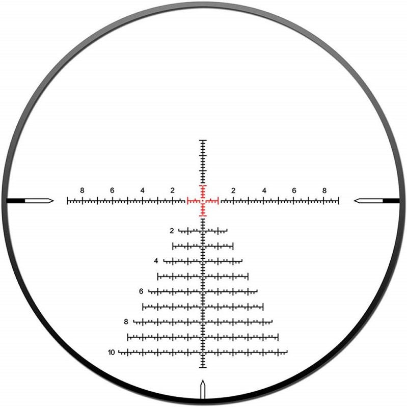 Прицільна сітка на основі Mil-dot - тонка і зручна для введення поправок по поділах як по вертикалі, так і по горизонталі, з урахуванням сили вітру. Сітка вигравірована на склі та розташована в першій фокальній площині FFP (First Focal Plane). Має червоне підсвічування з 6-ма рівнями регулювання (між кожним рівнем інтенсивності підсвічування знаходиться "0" (позиція його відключення) - є можливість швидко увімкнути/вимкнути підсвічування перебуваючи на будь-якому її рівні), контрольовану за допомогою колеса фокусування. Підсвічується невеликий центральний перехрестя, на всьому діапазоні кратностей зображення не має засвітів і відблисків.