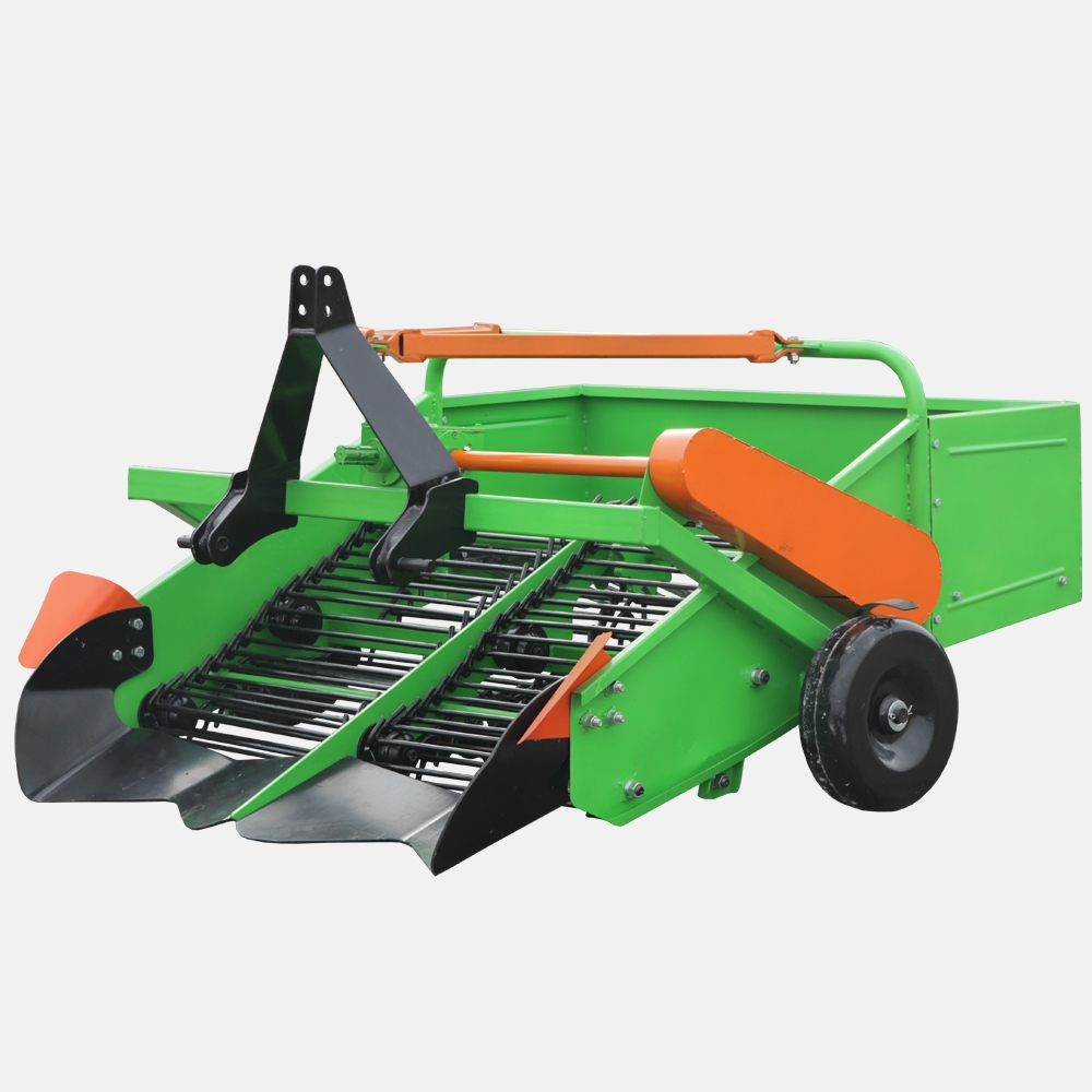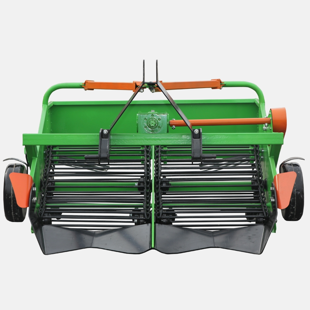 Картофелевыкапыватель навесной транспортерный 2-рядный используется для высокопроизводительной механизированной уборки картофеля и других корнеплодов, высаженных рядным способом с глубиной залегания до 15 см. Устанавливается на 3-точечную навесную систему, с помощью карданного вала стандартной длины подключается к валу отбора мощности трактора. Имеет жесткий корпус, в котором смонтирован транспортер из прочных металлических прутьев круглого сечения. Транспортер собран без применения каких-либо соединительных элементов, его звенья цепляются непосредственно друг за друга, поэтому он отличается исключительной эффективностью, надежностью и долговечностью. В движение транспортер приводится через закрытый конический редуктор, все подшипниковые узлы ведущей оси и поддерживающих роликов также находятся в закрытых корпусах. Нож изготовлен из цельного листа металла методом объемной штамповки. Он имеет сложную инновационную форму режущей кромки, обеспечивающую опти-мальный профиль канавки и подрезку боковых стенок. В задней части корпуса установлена отбойная гребенка, направляющая поток корнеплодов в нужную сторону. Максимальная глубина выкапывания ограничивается опорными колесами, ширина колеи которых варьируется от 130 до 180 см. Также можно настраивать поперечное положение картофелевыкапывателя относительно трактора.