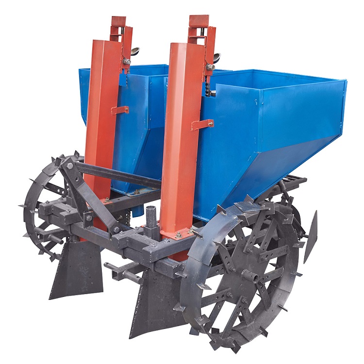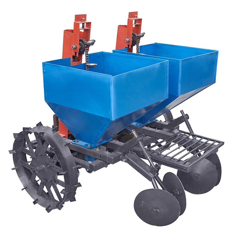 Бункера для клубней - металлические сварные, общей емкостью 300 л. Рама усиленная. Привод от опорных колес с почвозацепами на элеватор осуществляется цепной передачей. Ложечки для укладки картофеля расположены на цепи. Имеется регулировка межрядного расстояния и расстояния между клубнями в рядке. Борозда формируется клиновым сошником с регулируемым заглублением. При дополнительной установке туковысевающего аппарата одновременно с высадкой картофеля выполняется дозированное внесение в почву гранулированных минеральных удобрений.