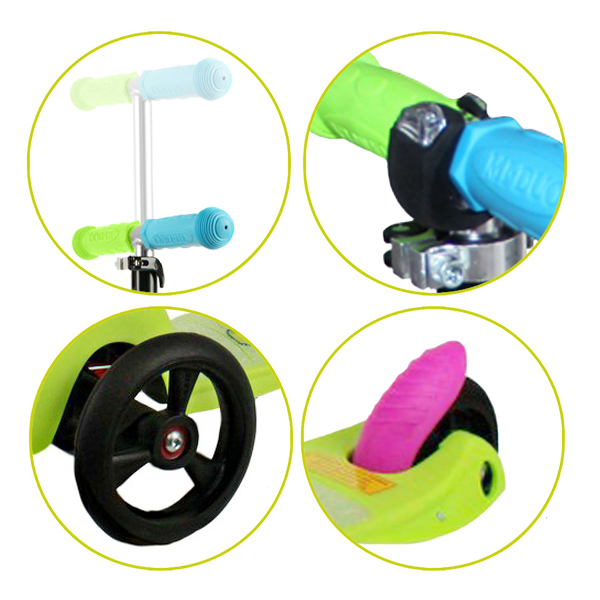 Оригинальности самокату придают черный руль с ручками разных цветов. Эти мягкие ручки не дают рукам соскальзывать. Платформа самоката выполнена из нейлона повышенной прочности. Кроме того, у самоката есть податливый задний тормоз, позволяющий вовремя останавливаться. Достаточно только нажать на него ногой. Также в комплект входит маленький фонарик.