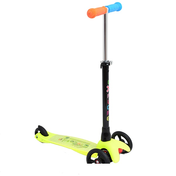 Оригинальности самокату придают черный руль с ручками разных цветов. Эти мягкие ручки не дают рукам соскальзывать. Платформа самоката выполнена из нейлона повышенной прочности. Кроме того, у самоката есть податливый задний тормоз, позволяющий вовремя останавливаться. Достаточно только нажать на него ногой. Также в комплект входит маленький фонарик.