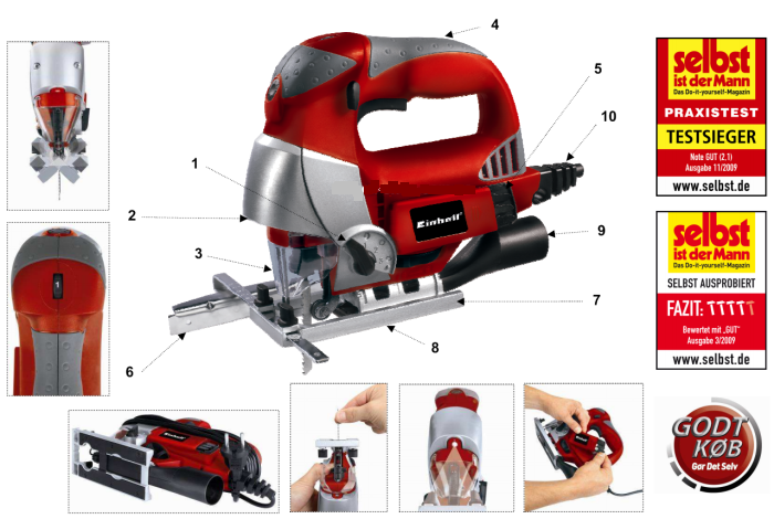 Наличие регулируемой подошвы с пластиковым покрытием, Led подсветки, электронного контроля скорости с преднабором частоты вращения, отделения для хранения пильных полотен и эргономический дизайн делают работу с лобзиком Einhell RT-JS 85 легкой и удобной. Замена пильных полотен осуществляется без применения каких-либо инструментов.