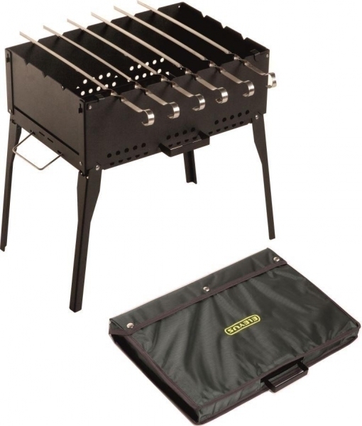 В сложеннном виде мангал складывается в ччехол, в котором находятся все детали и шампуры. Вес мангала 8 кг. Мангал комплектуется сумкой из плотного и качественного материала с клапанами на кнопке и вырезом для внешней ручки мангала.