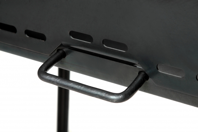 Мангал оснащен центральной большой ручкой и двумя дополнительными боковыми ручками, также в сумке есть специальная прорезь для центральной ручки. Расстояние между шампурами не 40 мм, а 60 мм, не ограничит вас в выборе размера кусков мяса.