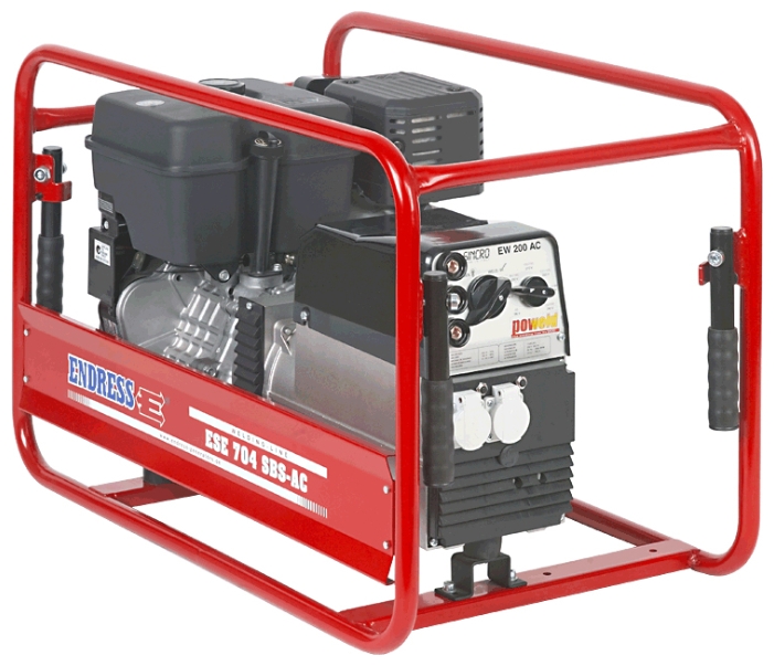 Серия электросварочных генераторов «Welding» включает в состав модель генератора Endress ESE 704 SBS-AC. Бензиновый сварочный генератор обеспечивает выполнение сварочных работ переменным током. Электросварочный генератор имеет диапазон регулирования производительности сварки 60 – 200 А. Механические элементы управления позволяют варьировать параметры работы сварочного генератора. Складные рукоятки электросварочного генератора Endress ESE 704 SBS-AC улучшают транспортабельность аппарата. Ручной надежный стартер двигателя обеспечивает его легкий запуск в любое время года. Производители оснастили электросварочный генератор бензобаком вместительности 7,9 л. Данного количества топлива достаточно для обеспечения непрерывной работы агрегата в 3,5-часовом интервале. Для обеспечения работы синхронного генератора был выбран бензиновый двигатель от надежного производителя «Briggs&Stratton». Отвечая требованиям мировых стандартов, бензодвигатель с рабочим объемом 391 см куб. совершает вращение с частотой 3 тысячи оборотов в минуту. Электросварочный генератор Endress ESE 704 SBS-AC позволяет подключать и использовать электроды диаметром, не превышающим 4 мм.