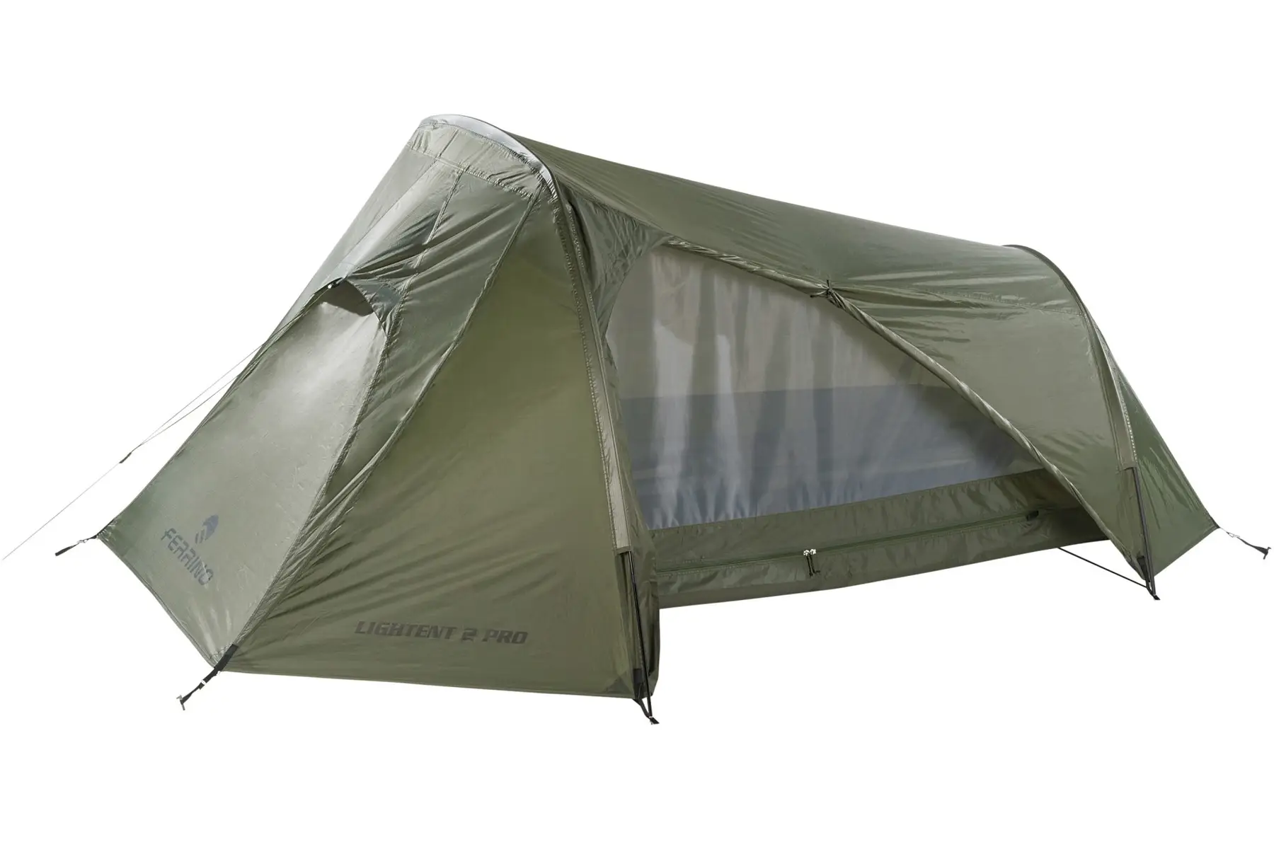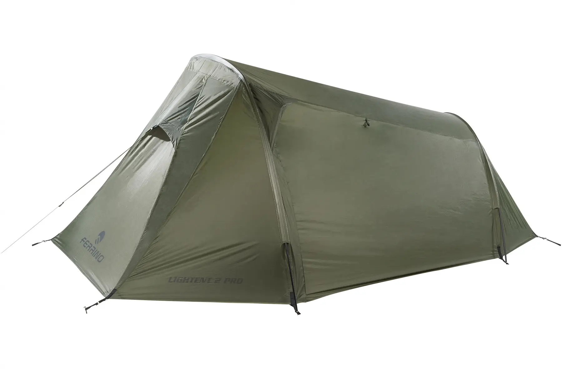 Ferrino Lightent 2 Pro Olive Green (92171LOOFR) відноситься до серії ультралегких наметів Ferrino Light Line. Дана модель має підвищену до 8000 мм вод. ст. водонепроникність дна та підійде не тільки для літніх, а й для весняно-осінніх походів, коли можливе випадіння великої кількості опадів. Внутрішній намет повністю складається з москітної сітки і попередньо прикріплений до зовнішнього тенту для швидкості установки. Тунельна конструкція забезпечує мінімальну вагу при більшому об'ємі внутрішнього простору, чому сприяють попередньо вигнуті алюмінієві дуги. Встановлення намету займає мало часу та потребує мінімум місця. Не дивлячись на те, що намет двошаровий, його вага складає всього 2,1 кг. Зовнішній тент має водозахист 3000 мм вод. ст., що є цілком достатнім для збереження намету сухим всередині під час дощу. Ефективна система вентиляції Camera Air доповнена бічним вентиляційним вікном, що допоможе уникнути утворення конденсату.