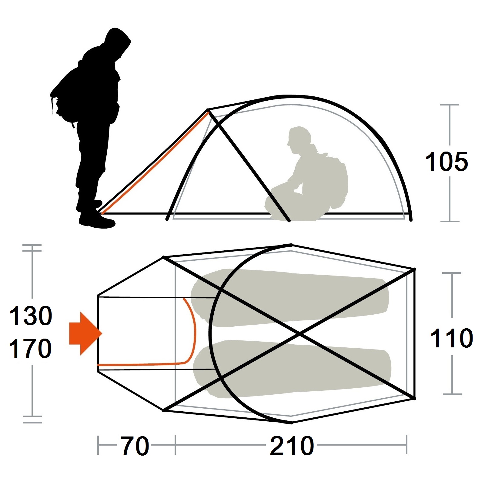Обновленная палатка Ferrino Pilier 2 (8000) Orange/Black практически не отличается визуально от ранней версии, тем не менее, изменения очень существенны. И в первую очередь это касается экзокаркаса, к которому теперь крепится не внутренний, а внешний тент, экономя время установки, и оставляя внутреннюю палатку сохой при установке под дождем. А также добавлены усилительные полосы материала вдоль каркасных дуг и часть пластиковой фурнитуры заменена на алюминиевую, что позитивно сказалось на устойчивости платки и надежности тента. Pilier 2 (8000) Orange/Black относится к серии палаток HighLab, отвечающих самым высоким требованиям. Данная модель рекомендована для длительных экспедиций, и высокогорных походов высокой сложности, в том числе и в климатических зонах с высокой влажностью и большим количеством осадков. Полугеодезическая конструкция гарантирует устойчивость палатки при максимальных снеговых и ветровых нагрузках. Установка такой палатки в хорошую погоду не требует фиксации колышками и растяжками. Компоновка с одним тамбуром требует минимум места для установки, а также уменьшает вес палатки по сравнению с двухтамбурными вариантами. Полугеодезическая конструкция обеспечивает действительно большой внутренний объем. Водозащита внешнего тента составляет 4000 мм в. ст., а пола - 8000 мм в. ст., что в несколько раз превышает нормативные требования к водозащитным палаткам и чего вполне хватает, чтоб сохранить палатку внутри сухой во время осадков высокой интенсивности. Чехол палатки имеет компрессионные стяжки, что позволяет добиться весьма компактных размеров упакованной палатки.