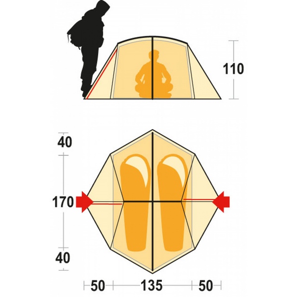 Не смотря на малый вес, палатка имеет два среднеразмерных тамбура для вещей, а благодаря увеличенному размеру спальных мест, палатка предоставит больше комфорта, чем привычный минимум. Поэтом данную модель особенно оценят велотуристы и любители походов налегке, которые ищут немного больше, чем походный минимум. Ferrino Spectre 2 Red/Gray идеальна для летних походов, так как внутренняя палатка на 75% состоит из москитной сетки, и её можно использовать отдельно от внешнего тента в теплые ночи. Внешний тент имеет красный сигнальный цвет, таким образом, палатка будет легко узнаваема и различима на фоне любого рельефа, будет меньше нагреваться на солнце и пропускать больше света чем модели с темным тентом. На противоположных сторонах палатки размещено по одному тамбуру и по одному входу на персону, позволяя комфортно пользоваться палаткой, не стесняя друг друга. Водозащита внешнего тента и пола составляет 3000 мм в. ст., что вдвое превышает нормативные требования к водозащитным палаткам и вполне хватает, чтоб сохранить палатку внутри сухой во время дождя средней интенсивности. Эффективная система вентиляции Camera Air имеет два вентиляционных окна и позволяет избежать образования конденсата. Чехол палатки оснащен компрессионными стяжками, что позволяет добиться весьма компактных размеров упакованной палатки.