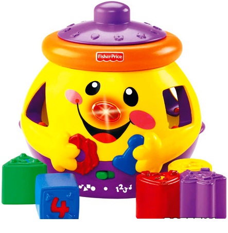 У Волшебного горшочка чудесное улыбающееся личико с носиком-кнопочкой и 5 отверстий геометрической формы по бокам. При нажатии на носик раздаётся какой-нибудь забавный звук или фраза, а в нём мигает яркая лампочка. На разноцветных кубиках — цифры от 1 до 5. Ребёнок вкладывает кубики в соответствующие по форме отверстия на горшочке. При правильном подборе фигуры звучит ободряющая фраза и весёлый музыкальный проигрыш. 2 варианта игры: — цифры – в этом случае произносится соответствующая кубику цифра; — формы – называется форма кубика. А теперь пора доставать кубики – снимаем крышечку и протягиваем руку внутрь… Звучит чудесная песенка о формах печенья, подпевай! Эта песенка будет звучать каждый раз, когда ребёнок что-то кладёт в горшочек сверху или достаёт из него. Во время звуковых эффектов ярко мигает носик Волшебного горшочка. Громкость регулируется – 2 положения переключателя внизу горшочка. Игрушка сочетает в себе возможность раннего развития и ежедневной практики. Способствует развитию тактильных ощущений и мелкой моторики пальчиков, укрепляет мышцы рук малыша, а также поощряет любопытство и знакомит с причинно-следственными связями. Игра помогает формированию у ребёнка восприятия формы и цвета, способствует развитию логического мышления.