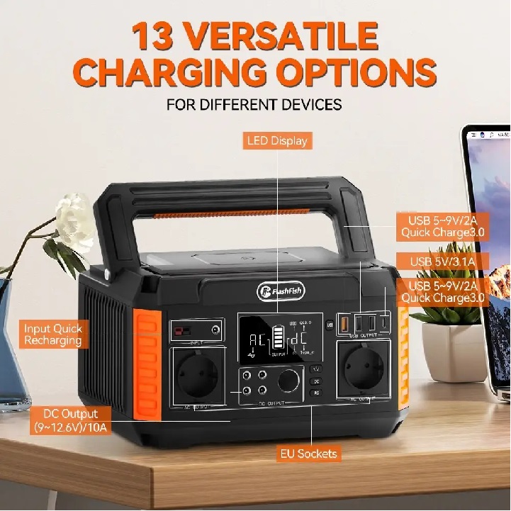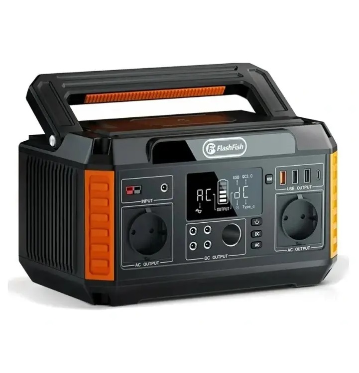 Источник питания FlashFish 520Wh оснащен литиевой батареей, которая может эффективно заряжаться от солнечной панели (не входит в комплект), адаптера переменного тока и автомобильного зарядного устройства (входят в комплект).