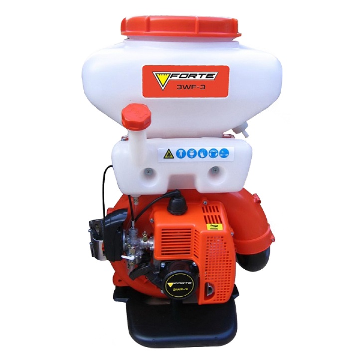 Для максимального удобства при эксплуатации предусмотрена эффективная антивибрационная система, также присутствует рукоятка управления, с помощью которой вы сможете регулировать интенсивность жидкости, тем самым контролировать процесс распыления. В роли привода (движущей силы) выступает 2-х тактный двигатель мощностью в 3 л.с и объемом цилиндра 42 см3, запускающимся ровно и плавно.  Мотоопрыскиватель Форте 3WF-3 отличается увеличенным радиусом распыления в 12 м, автономность в работе обеспечивает бак для жидкости объемом 14 л. Механизм функционирует бесшумно, не загрязняет окружающую среду, так как топливо смешивается с маслом в отношении 25:1.