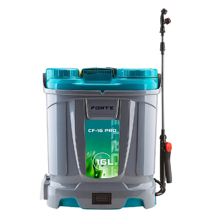 Обприскувач акумуляторний Forte допоможе швидко обробити великі площі посівів від шкідників та захворювань. Підкачування рідини відбувається автоматично завдяки наявності акумулятора, заряду якого вистачає кілька годин безперебійної роботи. Обприскувач має гнучкий шланг та телескопічну трубку, що дає великий радіус розпилення. Тому обробка території чи саду не триватиме багато часу. Широка горловина бака є зручною для приготування розчину. Дана модель має ергономічний дизайн і оснащена широкими ременями на плечах, які сприяють рівномірному розподілу ваги.