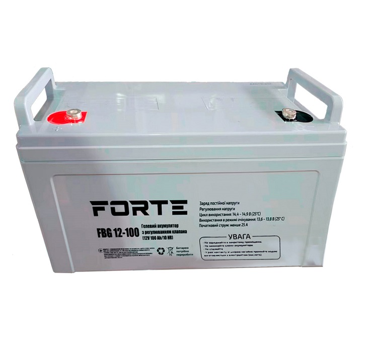 Гелевые аккумуляторные батареи FBG12-100 Forte с номинальной емкостью 100 Ач напряжением 12 В используются как элемент питания в автономных солнечных резевых системах энергоснабжения. FBG12-100 Forte относится к герметичным свинцово-кислотным гелевым аккумуляторным батареям с наличием предохранительного клапана, который защищает батарею от избытка давления в корпусе в период перезарядки. Такой тип аккумуляторных батарей не требует технического обслуживания, так как в течение срока службы нет необходимости проверять уровень электролита или добавлять дистиллированную воду. Низкий саморазряд.