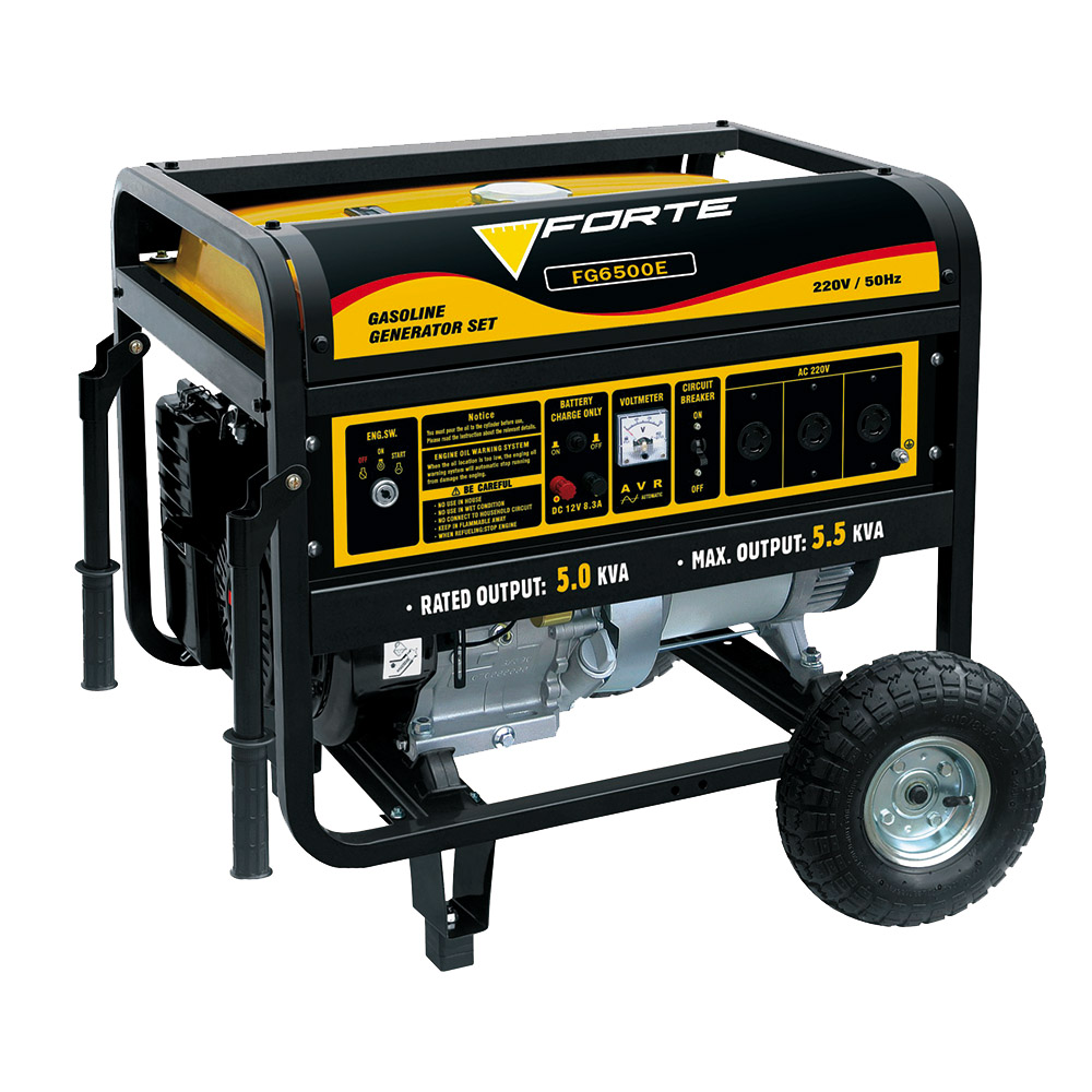 Небольшая мобильная электростанция FORTE FG6500EW рассчитана на однофазное подключение в небольших помещениях, например, на даче, складе или в гараже. Также его можно использовать для подключения различных электроинструментов, в случае проведения строительных или ремонтных работ. Кроме этого, модель можно применять в качестве сварочного аппарата. Диаметр электродов или сварочной проволоки составляет 2.2-5 м, при этом сварочный ток будет равен 25 В (200А).Бензиновый генератор оборудован надежным 4-х тактным бензиновым двигателем номинальной мощностью в 5 кВт с воздушным охлаждением и объемным топливным баком на 25 литров, что позволяет генератору работать беспрерывно на протяжении 8-ми часов.Однофазная бензиновая электростанция имеет отрытое исполнение и вставлена в прочную стальную раму. Внизу рамы размещаются 2-а транспортных колеса, которые в сочетании с удобными ручками упрощают перемещение прибора. Генератор FORTE FG6500EW примечателен также наличием электростартера, облегчающий запуск мотора. Такой тип старта наиболее прост для пользователей, он не требует больших усилий. Для перехода в рабочий режим достаточно нажать одну кнопку.
