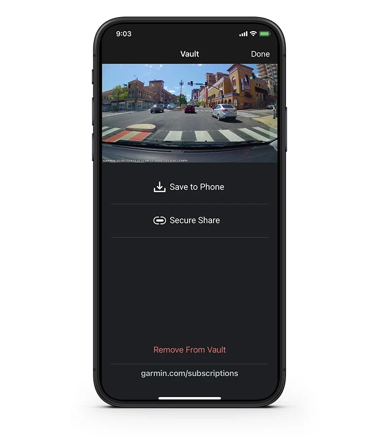 Сховище Vault полегшує безпечний обмін важливими відеозаписами. Завдяки платній підписці на Vault і приєднанню до Wi-Fi®, збережені відео доступні через додаток Garmin Drive на вашому сумісному смартфоні.