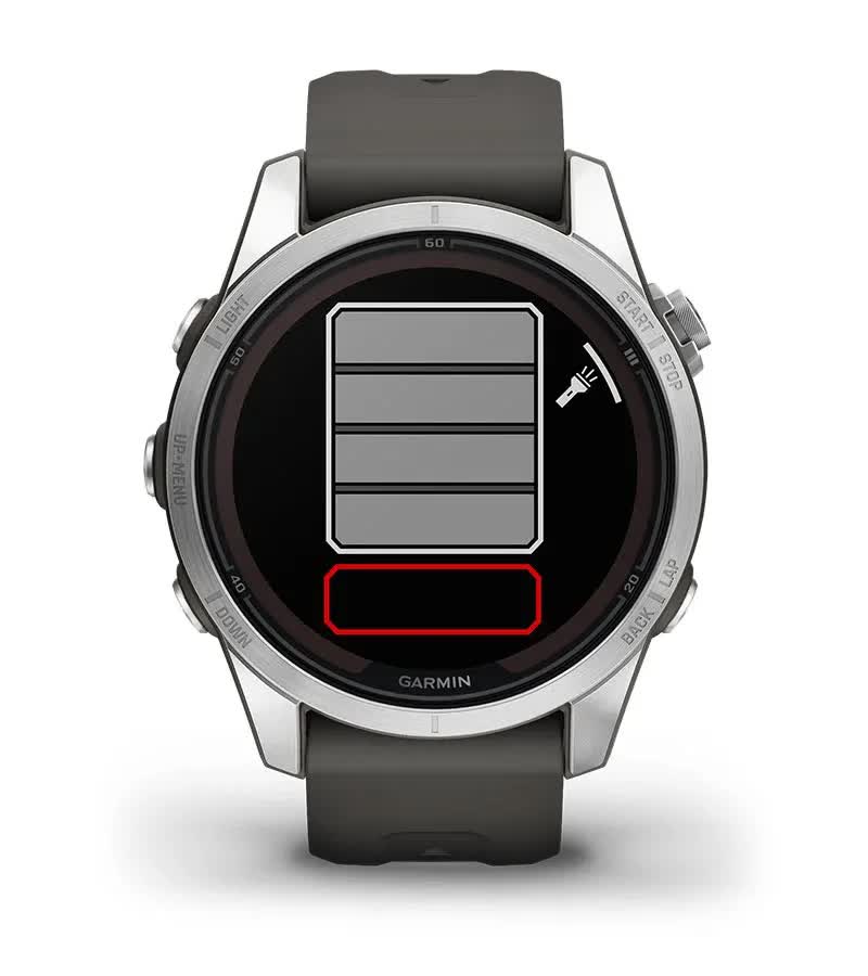 Змінна інтенсивність світлового променя та червоне світло безпеки покращують вашу видимість на тренуваннях у темряві. Також ліхтарик на годиннику служить як зручне підсвічування, коли ви цього потребуєте. У режимі стробоскопа біле світло чергується з червоним, підлаштовуючись під ваш ритм бігу.