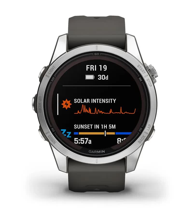 З лінзою, що заряджається від сонячної батареї, ваш пристрій працюватиме до 14 днів у режимі розумного годинника за умови використання протягом 3 годин на день під прямим сонцем (50 000 люкс). У режимі GPS з підзарядкою від сонця пристрій тримає заряд до 46 годин (за умови безперервного використання впродовж усього періоду в умовах освітлення 50 000 люкс).