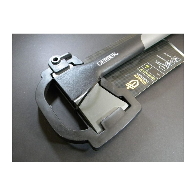 Традиционно высокое качество и надежность продукции – такие слова можно сказать о продукции компании «Gerber», штаб-квартира которой располагается в городе Портленд, США. Рубящая часть топора Gerber Sport Axe II изготовлена из кованой стали, обладающей повышенной прочностью и достаточной твердостью, и дополнительно покрыта слоем тефлона. Топорище сделано из армированного стекловолокном полиамида – FiberCompTM, разработанного с учетом придания материалу максимальной прочности и долговечности. Кроме того, данный материал обеспечивает надежное удерживание топорища в руке даже в дождливую погоду. Топорище ближе к концу полое внутри, что сделано для смещения центра тяжести топора к головке. Длина рубящей кромки – немного больше 6,5 см, а длина всего топора – 35 см. Обух топора можно использовать в качестве молотка, например, при установке мангала. В топорище предусмотрено отверстие для темляка. Для транспортировки в комплекте к модели идет специальный защитный чехол из пластика с удобной ручкой для переноса. Топор поставляется на рынок упакованным в блистер.