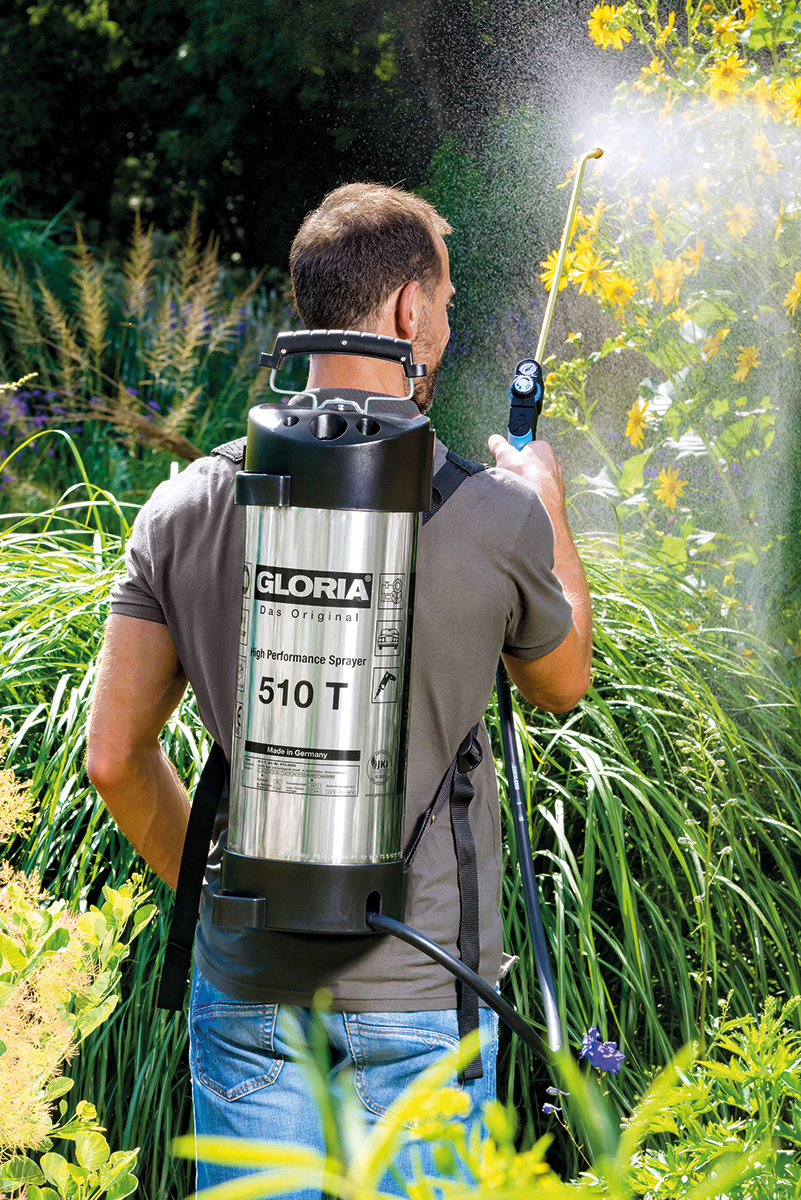 У высокопроизводительного распылителя 510 T напорный резервуар из нержавеющей высококачественной стали, который может вместить до 10 л распыляемого средства и подходит для рабочего давления макс. 6 бар.