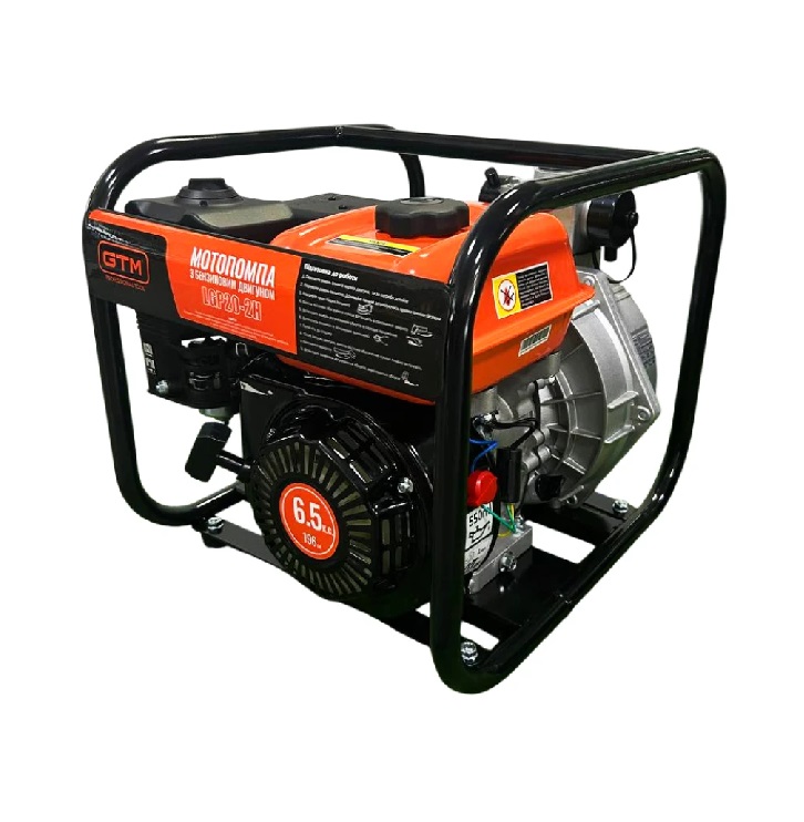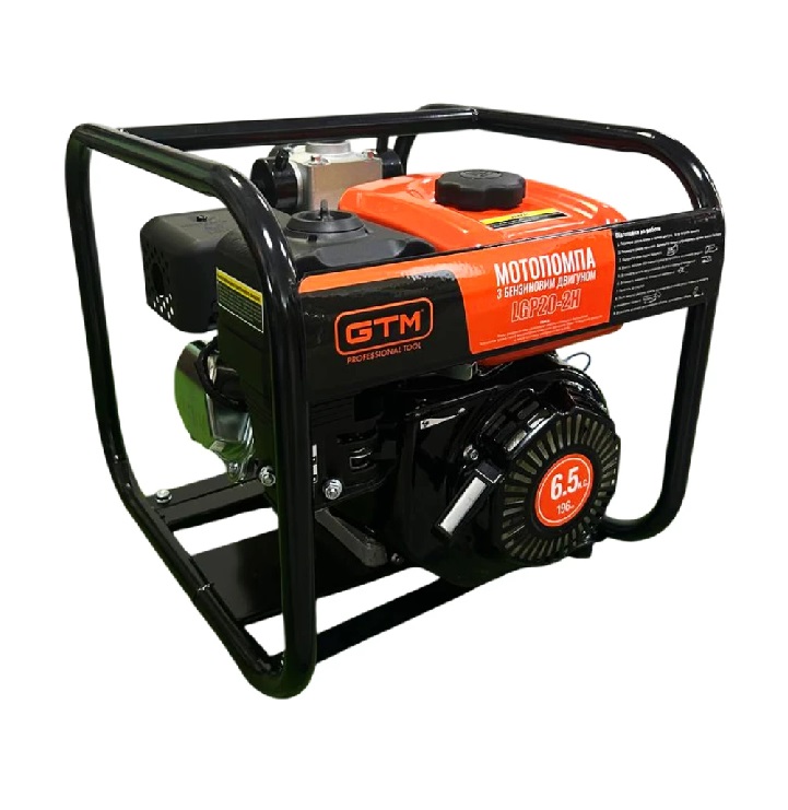 GTM LGP20-2H - високонапірна мотопомпа для перекачування великих обсягів чистої води. Надійний бензиновий двигун потужністю 6,5 к.с. та механізм насосу забезпечує висоту підйому до 80 м.