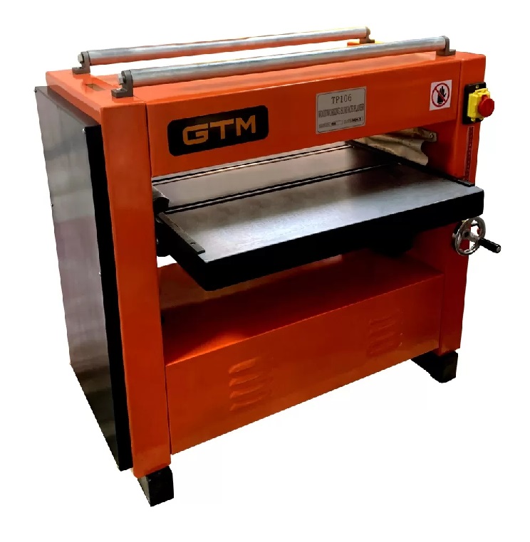 Рейсмусовый станок TP106 предназначается для чистового строгания досок под заданную толщину. Съём древесины осуществляется 4 ножами из закаленной стали, которые закреплены на вращающемся валу с диаметром 77 мм. Вал приводится в движение 3-фазным двигателемс мощностью 3 кВт. Станок GTM TP106 способен работать с досками шириной до 600 мм и толщиной от 10 мм до 120 мм. Толщина при работе регулируется с помощью рычага с фиксацией и мерной линейки. Скорость подачи заготовки достигает 13,5 м/мин. Для работы с крупногабаритными досками есть возможность подсоединить специальное удлинение.