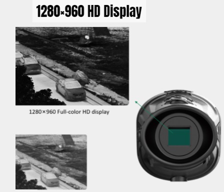 Полноцветный LCOS дисплей 0.4 inch с разрешением 1280×960 пикс передает картинку в HD качестве. Полный размер обеспечивает увеличивающая линзовая система окулярного блока. Широкие пользовательские настройки по изменению яркости, контраста. В ручном режиме можно выбрать один из 10 уровней. Опция временного отключения дисплея поможет избежать демаскировки. Доступна диоптрийная корректировка в пределах -2+5 дптр, поможет настроить картинку под индивидуальные особенности зрения.