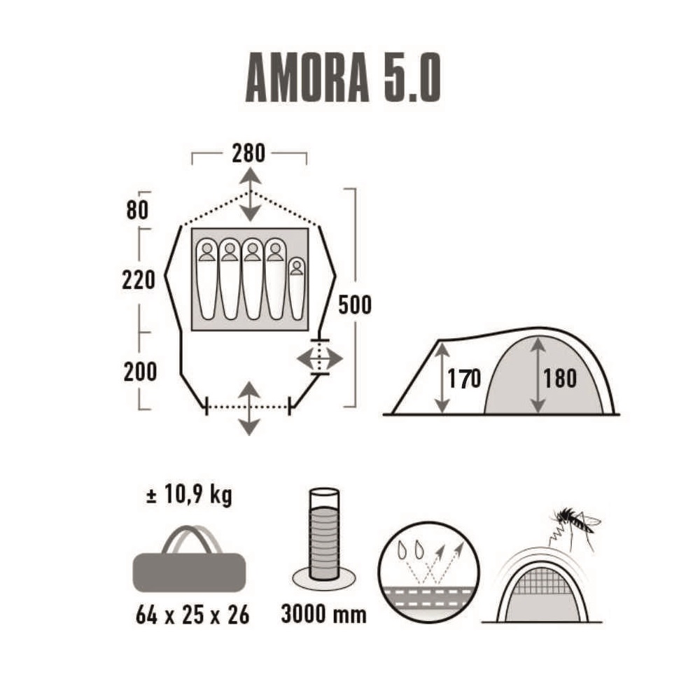 Палатка премиум-класса High Peak Amora 5.0 с инновационной системой вентиляции, создаст уют и комфорт для 5 человек. Наличие двух регулируемых систем вентиляции Adanced Low Vent и Vario Vent Control способствуют созданию в палатке максимально комфортного микроклимата при любых погодных условиях. Просторная, затемненная спальня дает возможность отдохнуть не только ночью, но и комфортно восстановиться после полудня, создав свою сиесту. Использование новых высококачественных материалов позволило повысить степень защиты человека от вредного воздействия ультрафиолетовых лучей в соответствии с стандартом - UV STANDARD 801. Внутренняя часть тента имеет специальное алюминизированное покрытие, которое обеспечивает дополнительную термоизоляцию. Два раздельных тамбура позволят разместить туристический инвентарь. Антимоскитные сетки расположены на 3-ох входах в палатку, а также на входе в спальную комнату.