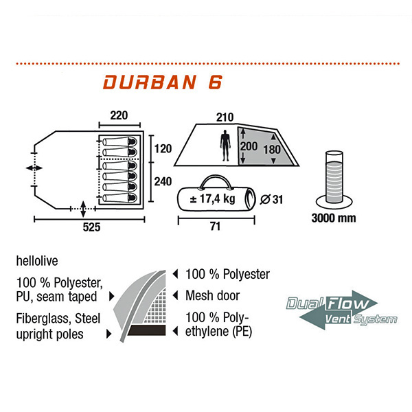 Кемпинговая 6-ти местная палатка для длительного отдыха, с разделяемым спальным отсеком. Просторная гостиная (11 м²), большой тамбур с полом идеально подходит для размещения багажа или организации кемпинговой кухни.Благодаря наличию двух входов, позволяет использовать её как в базовом лагере, так и для семейного отдыха на природе. Козырек тамбура устанавливается на стальные стойки, москитная сетка на входе в спальное отделение, проклеенные швы тента, эффективная система вентиляция Dual Flow обеспечивает комфортный микроклимат при любых погодных условиях