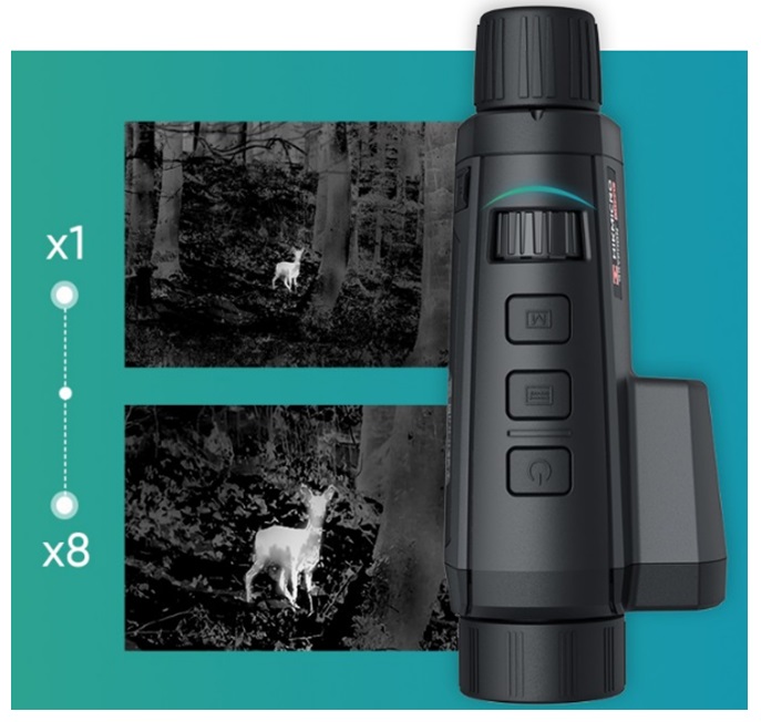 Тепловізор Хикмикро Грифон GH25 володіє значною дальністю виявлення ростових теплоконтрастных цілей. Виявити тварина типу: олень, дорослий кабан, ведмідь або осіб можна з відстані близько 1200 метрів. Перешкодою для спостереження не стануть інтенсивні атмосферні опади у вигляді снігу або проливного дощу, туману, задимлення території або повної відсутності освітлення. Тепловізійна техніка добре «бачить»крізь нещільну рослинність: звисаючі гілки дерев, кущі, рідкісна просіка або очерет. Реалізувати потенціал проділів вдалося завдяки застосуванню високотехнологічних сенсорів нового покоління 384х288 pix. @ 12µm (NETD <35 mK) і длиннофокусной германієвої оптиці.