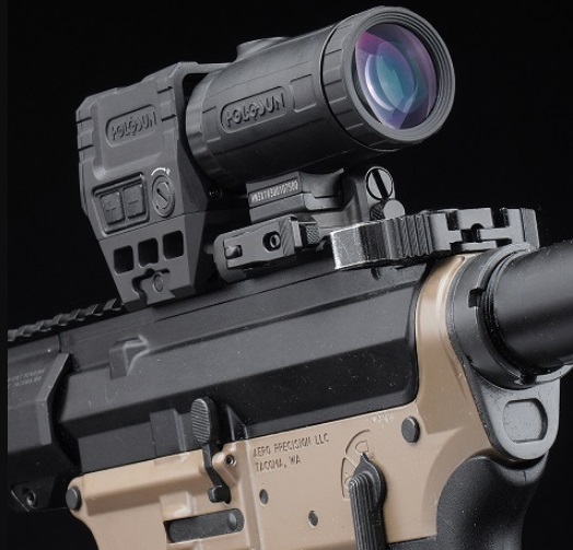 Magnifier Holosun HM3X поставляется с быстросъемным типом крепления на рельсовые системы Вивера / Пикатини. Защелка, удерживающая прибор в рабочем положении, находится в доступности, позволяя откидывать и возвращать увеличитель в считанные мгновения. В комплекте имеется специальная проставка, для адаптации под коллиматоры с разной величиной оптической оси: 37 мм (Co-witness) или высокой 41,6 мм (Lower 1/3 co-witness).