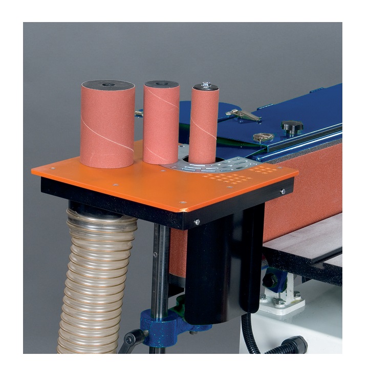 Шлифовальный станок по дереву HOLZKRAFT KSO 1500 имеет шпиндельно-осцилляционную приставку для радиусной обработки деревянных заготовок. Что позволяет производить шлифование круглых кромок, внутренних радиусов изделий. Осцилляция шлифовальной ленты реализуется через три резиновых ролика (Ø 38/50/76 мм), три абразивных шлифовальных ленты (шириной 100 мм), регулируемый по высоте стол с всасывающим устройством диаметром 100 мм.