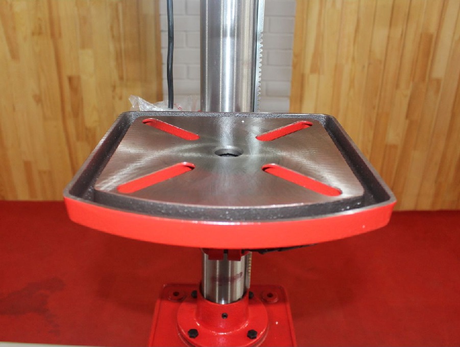 Заготовку размещают на регулируемом чугунном столе. Он поворачивается вокруг горизонтальной оси, перемещается вверх и вниз по колонне, а если потребуется разместить крупную заготовку, может быть отведен в сторону разворотом на колонне. В таком случае опорой выступает верхняя поверхность подставки станка, отфрезерованная в плоскость, перпендикулярную оси сверления.