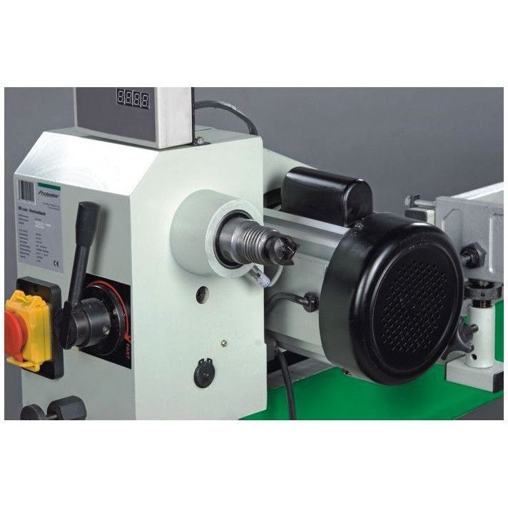 Станок оснащен вариатором оборотов, что позволяет мастеру плавно регулировать скорость вращения шпинделя, выбирая нужный скоростной режим. Диапазон скоростей, предложенный в этой модели, токарного станка находится в промежутке от 500 оборотов в минуту до 2000. На верхней части передней бабки расположен индикатор, отображающий скоростной режим вращения шпинделя.