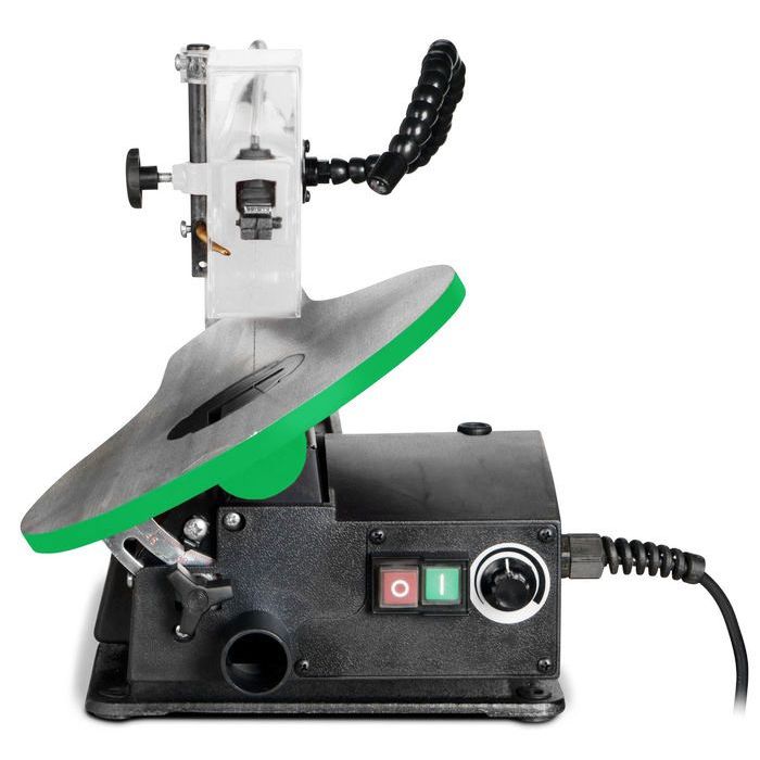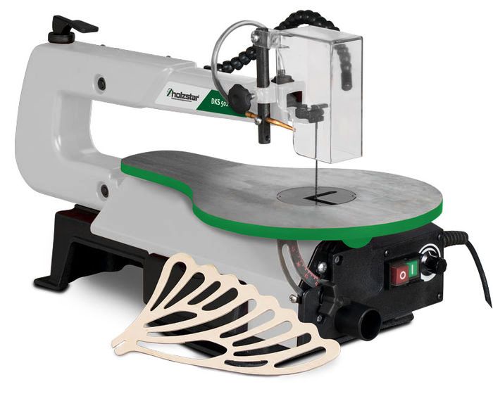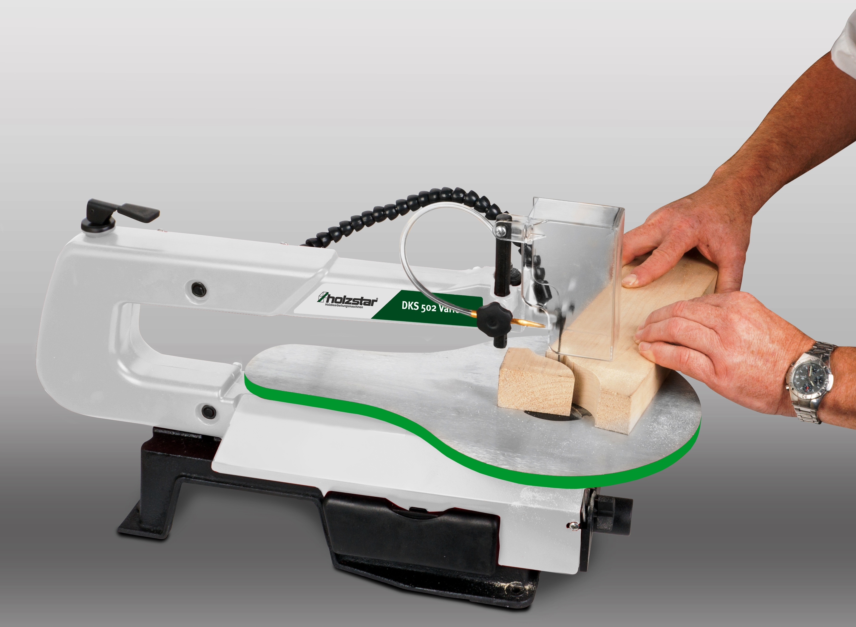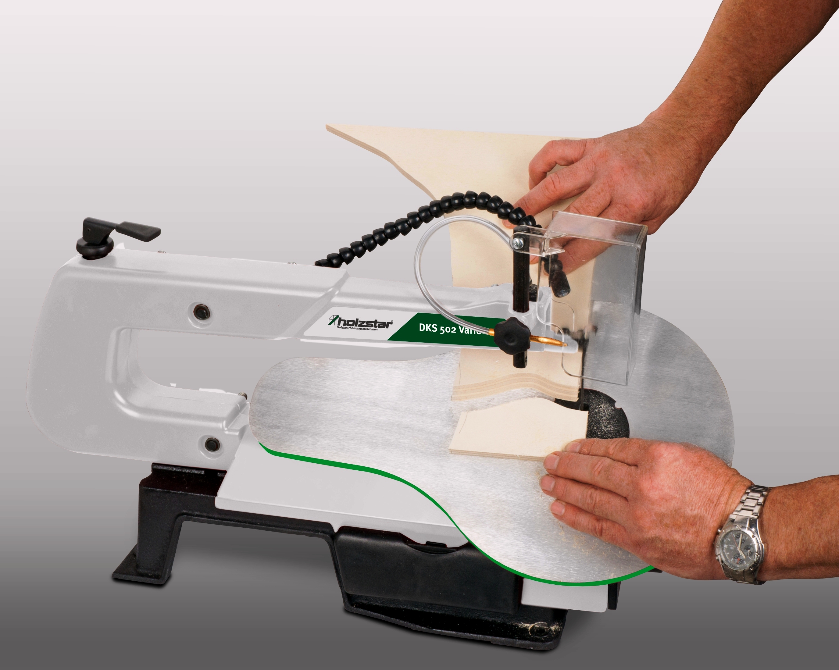 Мощный лобзик по дереву с чугунными станиной и столом - Holzstar DKS 502 Vario используют при производстве игрушек в школьных мастерский, испытательных лабораториях, при изготовлении моделей из дерева, для выпиливания внешних и внутренних криволинейных контуров сложной формы. Он предназначен для резки мягкой древесины (<50 мм), пластмассы (<30 мм) или цветных металлов (<10 мм). Глубина вылета составляет 406 мм, что позволяет без труда производить обработку крупногабаритных заготовок и деталей.