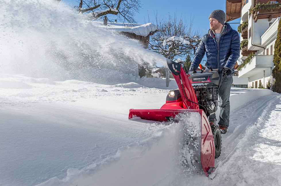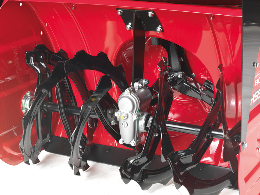 Система Free-Lock, работа которой основана на использовании газового амортизатора, позволяет без усилий точно регулировать высоту уборки снега, не прерывая движение, а также двигаться назад, приподняв заборник. Регулировка осуществляется нажатием рычага под правой рукояткой. Если необходимо убрать наледь, снегозаборник (носовую часть) наклоняют вниз, тем самым нагружая фронтальную часть. Электрическая регулировка положения желоба выброса снега. Бросайте снег, куда хотите! Управляя джойстиком на панели оператора вы задаете направление и угол выброса снега электрическим приводом механизма поворота выпуского желоба. Джойстик управления направляющего желоба — одна ручка управления (4-направления), радиус поворота до 198°) Снегоуборщик Honda HSS 970 ETD работает с использованием зубчатых шнеков, позволяющих не взбираться на кучу снега, а сначала раздробить ее и отбросить в сторону. Очень удобная опция для тех, кто занимается уборкой снега нерегулярно. В моделях 2016 года выпуска конфигурация шнека изменена для улучшения очистки снега. Если во вращающийся шнек снегоуборочника попадет посторонний предмет, например, камень, то срабатывает датчик защиты от перегрузки и двигатель останавливается. Таким образом предотвращается повреждение шнека. После устранения постороннего предмета снегоуборочник можно запустить заново и продолжить работу. Мощная рабочая светодиодная фара позволяет комфортно работать в любое время. Куски снега попадают в шнек, где тщательно перемалываются, после чего с большой скоростью выбрасываются через желоб, дальность выброса: до 16 метров