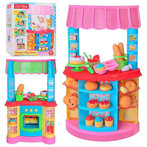 В игровой набор кондитерская входит 30 элементов: форма для кексов, подставка для торта, корзина для багетов, разные кухонные принадлежности, разнообразные хлебобулочные изделия.