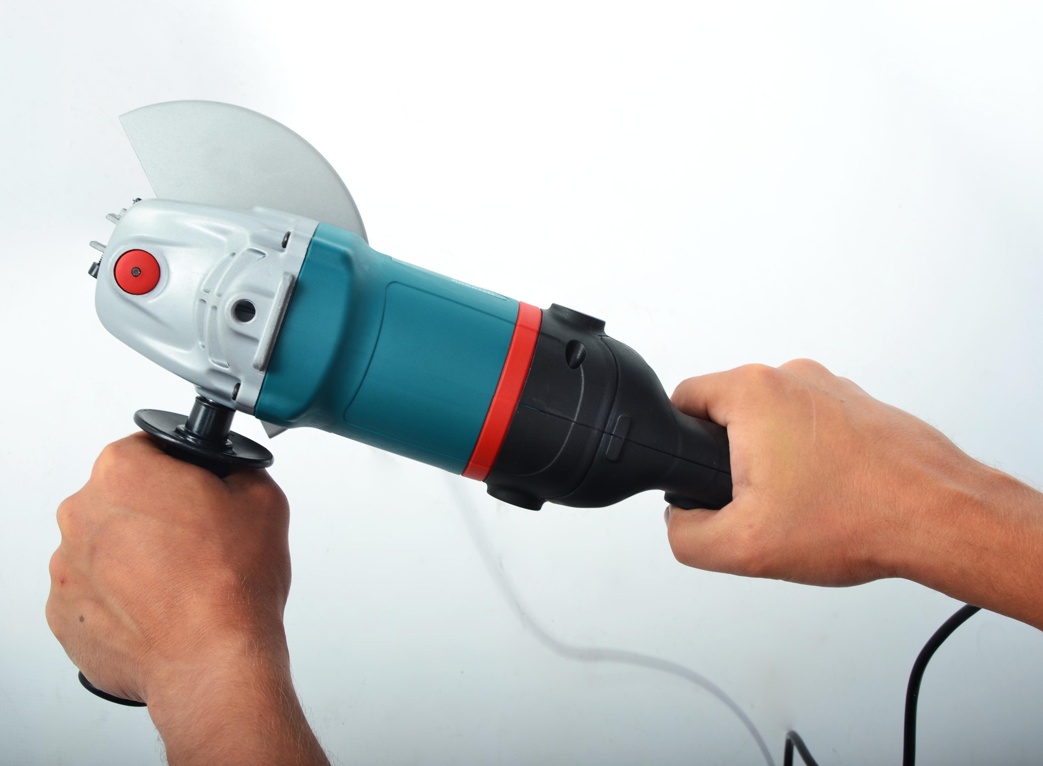 Ручная болгарка отличается узнаваемым дизайном. Обтекаемая форма и плавность линий способствуют хорошему захвату. Небольшой объем позволяет использовать инструмент в узких пространствах с ограниченным подходом. Продуманность деталей обеспечивает комфорт и удобство оператора во время продолжительных работ. Для поддержания правильного температурного баланса предназначены вентиляционные отверстия. Для замены режущих насадок используется специальная кнопка блокировки шпинделя. При нажатии на нее, останавливается вращение вала и мастер может за короткий промежуток времени и с предельной безопасностью поменять оснастку. Кнопка расположена в верхней части корпуса. Быстрозажимное устройство крепления дисков и кругов не требует дополнительных приспособлений. В данной модели для основного захвата используется рукоятка, продолжающая корпус болгарки. Ее специфическая форма и прорезиненная поверхность позволяет прочно и уверенно удерживать инструмент долго время, не смотря на вес 3 кг. Загиб на конце рукоятки не даст болгарке выскочить из рук во время работы. Кнопки включения и блокировки двигателя находятся прямо под рукой у оператора.