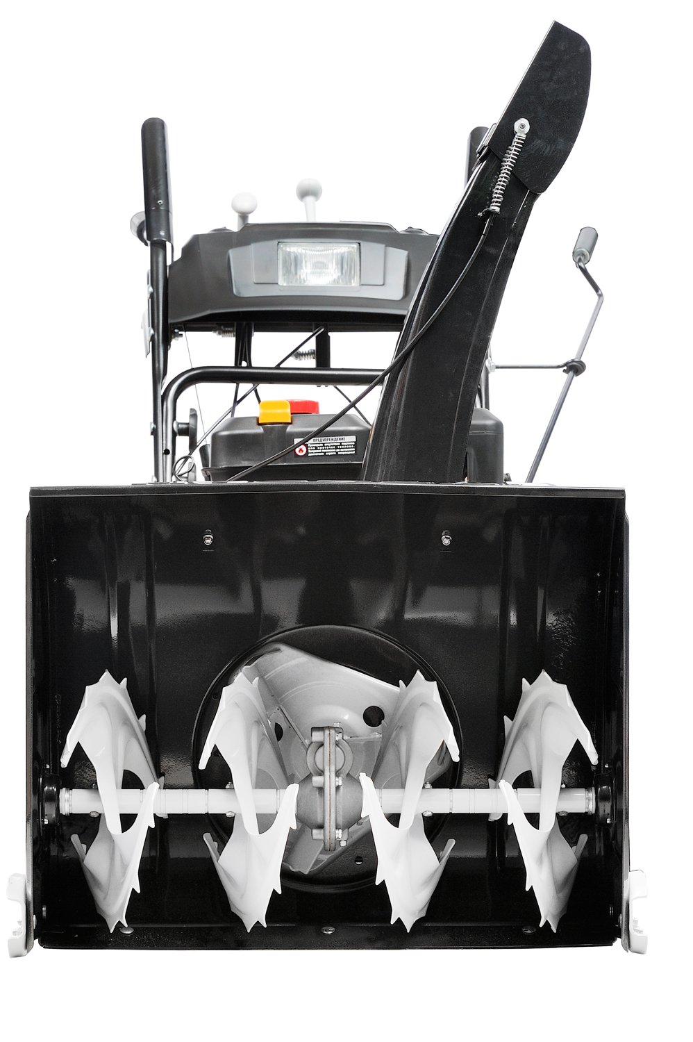 Учитывая, что в зимний период световой день очень короткий, на данной модели установлена мощная фара, которая поможет оператору хорошо просматривать площадку в любое время суток. Галогенный светильник хорошо освещает направление движения даже в туман и сквозь летящие снежинки. Кнопка включения фары находится перед оператором на панели управления. Высокое положение светильник позволяет освещать большую территорию. Комбинация из ручного стартера и электрозапуска гарантирует запуск при любых климатических условиях. Самый быстрый вариант – это пуск с помощью электростартера, удобно и просто. Надежная и проверенная десятилетиями система старта с помощью вытяжного тросика, тоже не составляет особых проблем. Тем более, что конструкция предусматривает несколько систем облегчающих пуск, снижающих давление в цилиндре и обеспечивающих стабильную искру. Контроль за вращением шнека обеспечивает модернизованный редуктор, который передает максимальный крутящий момент от работающего двигателя. Рабочие шестерни сделаны из мягкого металла, что поможет защитить двигатель от заклинивания при попадании крупного предмета. Основной защитой от внезапных столкновений служат срезные болты, которые ограждают механизмы от серьезных физических нагрузок.