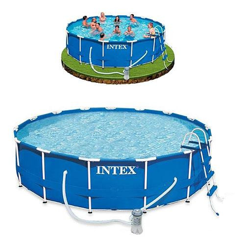Процесс сборки бассейна до наполнения водой занимает всего 45 минут. Бассейн изготовлен из высококачественного материала с применением технологии Super-Tough, которая придает стенкам бассейна тройную прочность. Стенки сделаны из трех отдельных слоев: два слоя плотного винила и один - полиэстр для особой прочности. Поддержанию формы бассейна Metal Frame Pool способствует лента из полипропилена, опоясывающая весь бассейн. Также прочность бассейна Intex обуславливается его металлическим каркасом, благодаря которому бассейн выдерживает большие нагрузки и в нем одновременно могут купаться несколько человек.Фильтрующий насос обеспечивает рециркуляцию и очистку воды в бассейне, что позволяет менять воду не чаще 1 раза в месяц.