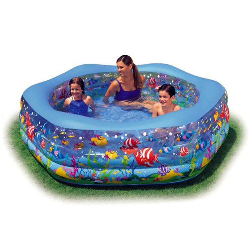 Этот бассейн по праву станет настоящим украшением любого участка. Его стильная раскраска будет манить всех без исключения. Бассейн Интекс 56493 выполнен из полупрозрачного прочного ПВХ, что придает ему необычайную легкость и изящество. Данная модель Intex (Интекс) имеет удивительную особенность – у него надувное дно, что придает дополнительный комфорт. Размер чаши позволит играть в бассейне трём — четырём ребятишкам.