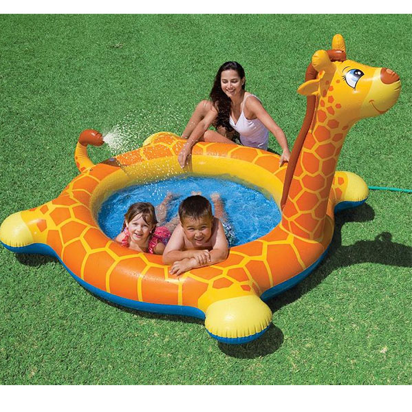 Детский надувной бассейн в виде веселого, забавного "Жирафа". В нем детишки смогут от души покупаться, поплескаться и поиграть, а охладиться в жаркую погоду поможет хвостик – фонтанчик, который работает от садового шланга.