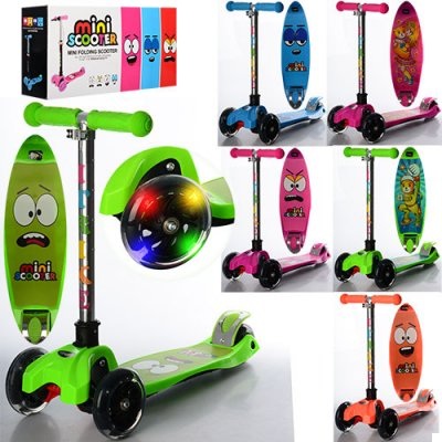 алюминиевые и пластиковые элементы; регулируемая ручка по высоте (до 77 см); возможность складывания: да; материал колес: PU; светятся колеса; размер колес: передние — 125 мм, заднее — 80 мм.