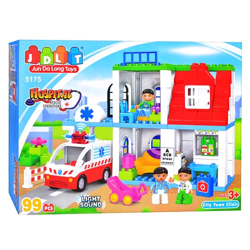 Из пластиковых деталей среднего размера малыши легко соберут двухэтажное здание больницы, автомобиль со звуковыми и световыми эффектами. В набор входит 99 деталей, батарейки не прилагаются.