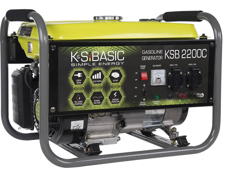Лінійка бензинових «K&S Basic» генераторів створена на базі фірмових двигунів KSB, що відрізняються відносно тихою роботою та надійністю завдяки верхньому розташуванню впускних та випускних клапанів. Двигуни відповідають усім світовим та європейським стандартам якості, економічності, екологічності (зокрема рівень шкідливих викидів та рівень шуму). Кожний двигун та кожний генератор мають свої індивідуальні серійні номери, що дозволяє нам контролювати якість виробництва та сервісного обслуговування. Для зручності транспортування використовуються еластичні рукоятки, які відмінно доповнюють дизайн і кінцевий вид товару. Простий в управлінні агрегат не потребує особливих навичок, доступний для використання всіма категоріями користувачів. Зручний ручний запуск дозволяє швидко завести двигун, не докладаючи значних зусиль.