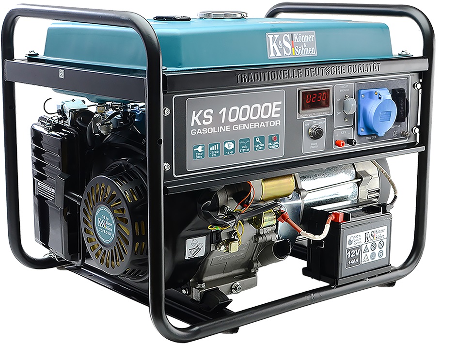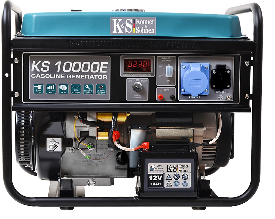 Для торгової марки «Könner & Söhnen» спеціально були створені двигуни серії KS, що пройшли багатогодинні та багаторівневі тести. Фірмові двигуни KS надійні, зносостійкі та економічні. Надійний двигун Könner & Söhnen відповідає всім європейським стандартам якості, в тому числі сучасному екологічному стандарту EURO V. Двигуни відповідають усім світовим та європейським стандартам якості, економічності, екологічності (зокрема рівень шкідливих викидів та рівень шуму). Кожний двигун та кожний генератор мають свої індивідуальні серійні номери, що дозволяє нам контролювати якість виробництва та сервісного обслуговування. Двигуни Könner & Söhnen вирізняються легким стартом та пониженою вібрацією. Лінійка бензинових генераторів KS 10000 оснащена надійним 1-циліндровим двигуном потужністю 18 к.с.Система полегшеного старту дозволяє швидко завести двигун, не докладаючи значних зусиль. Більш потужні моделі додатково обладнані системою електричного старту для зручності використання.