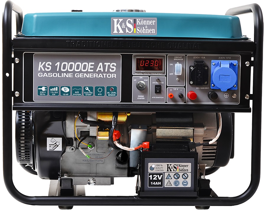 Для торгової марки «Könner & Söhnen» спеціально були створені двигуни серії KS, що пройшли багатогодинні та багаторівневі тести. Фірмові двигуни KS надійні, зносостійкі та економічні. Надійний двигун Könner & Söhnen відповідає всім європейським стандартам якості, в тому числі сучасному екологічному стандарту EURO V. Двигуни відповідають усім світовим та європейським стандартам якості, економічності, екологічності, в тому числі сучасному екологічному стандарту EURO V. Кожний двигун та кожний генератор мають свої індивідуальні серійні номери, що дозволяє нам контролювати якість виробництва та сервісного обслуговування. Двигуни Könner & Söhnen вирізняються легким стартом та пониженою вібрацією. Лінійка бензинових генераторів KS 10000 оснащена надійним 1-циліндровим двигуном потужністю 18 к.с. Панель генератора з функцією АВР (автоматичний ввід резерву) оснащена: клемами для підключення електропостачання, вмикачем функції АВР та індикатором роботи АВР.