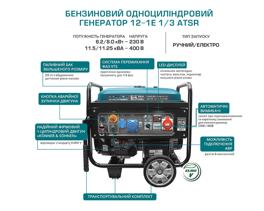 Генератор оснащений можливістю підключення системи АВР, та унікальною технологією перемикання фаз VTS, яка дає можливість працювати в однофазному (230В) або трифазному (400В) режимі без втрати потужності. Зручна, ергономічна панель керування з кнопкою аварійної зупинки генератора та багатофункційним LED-дисплеєм, що дозволяє контролювати роботу генератора — напругу, частоту, кількість відпрацьованих годин, а також рівень оливи. Кожна модель оснащена розетками, що дозволяють знімати максимальну потужність, яка віддається приладом, розетки обладнані запобіжниками та комплектуються відповідними вилками. Місткий 55-літровий паливний бак забезпечує тривалу і безперервну роботу. Переглянути відео. Потужний 1-циліндровий чотиритактний двигун з повітряним охолодженням (18.5 к.с.). Двигуни відповідають усім світовим та європейським стандартам якості, в тому числі сучасному екологічному стандарту EURO-V. Кожен двигун має індивідуальний номер, що дозволяє контролювати якість виробництва та обслуговування. Для зручності використання генератори цього типу мають три виду запуску: ручний або електрозапуск, а також можливість підключення блоку АТС (автоматичного вводу резерву).