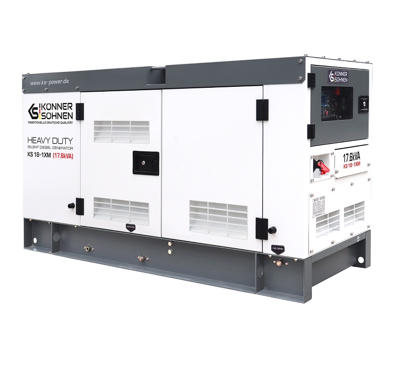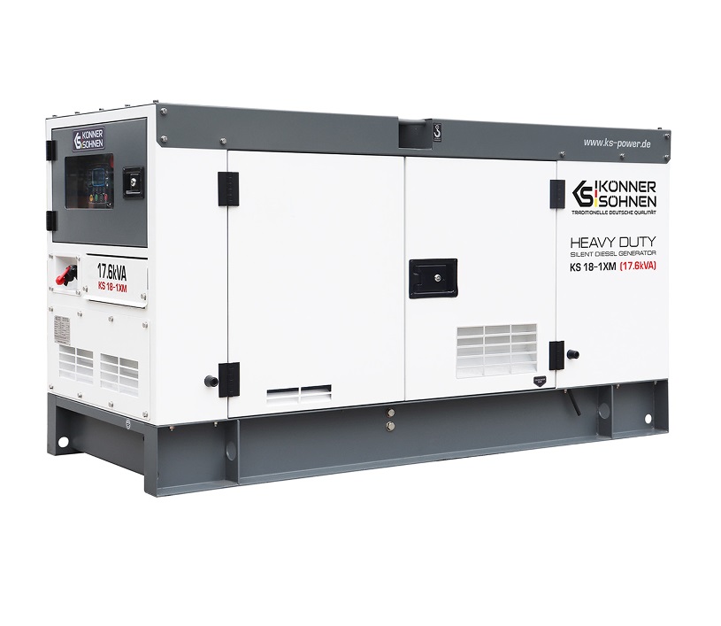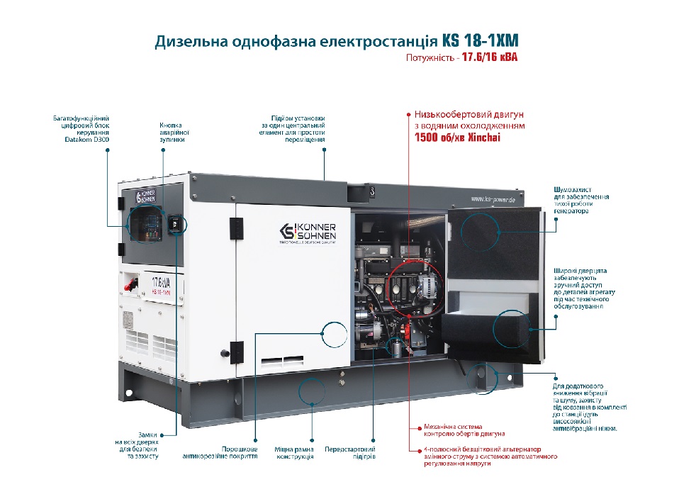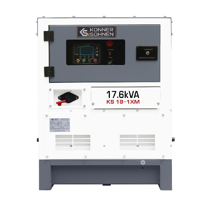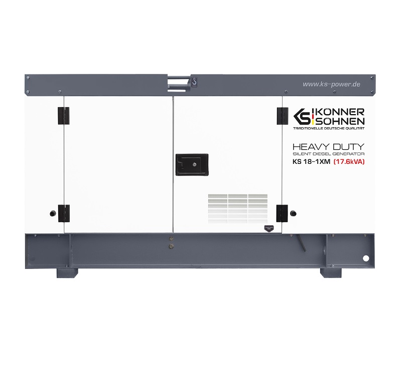 Дизельна однофазна електростанція KS 18-1XM серії HEAVY DUTY німецької торгової марки Könner & Söhnen – це надійна генераторна установка максимальною потужністю 17.6 кВА, що повністю відповідає високим європейським стандартам якості. Станція оснащена низько обертовим 4-циліндровим двигуном Xinchai з рідинним охолодженням. Xinchai Co. Ltd -це всесвітньо відомий виробник багатоциліндрових дизельних двигунів (в тому числі для будівельної та сільськогосподарської техніки) з досвідом у розробці та виробництві понад 40 років. Високотехнологічне виробництво Xinchai має бездоганну ринкову орієнтацію та та розробляє двигуни з більш ефективними параметрами, меншим споживанням палива та меншим викидом шкідливих газів. Модель дизельного генератора KS 18-1XM оснащена 4-полюсним безщітковим альтернатором змінного струму з системою автоматичного регулювання напруги, підігрівом для зимового використання, з паливним баком на 53 літри, розрахованому на 15 години автономної роботи без дозаправки (при середньому навантаженні 50% витрата палива складає 3,59 літри/год), можливістю підключення системи автоматичного запуску/зупинки, всепогодним захисним антивандальним корпусом із звукоізоляцією. Завдяки впровадженню власних розробок компанії та адаптації під вимоги Könner & Söhnen всі електростанції мають запас потужності по відношенню до заявлених характеристик. Потужний дизельний генератор KS 18-1XM – це професійний агрегат, розроблений за допомогою передових технологій, при цьому простий у використанні пристрій, що може забезпечувати живлення потужних однофазних споживачів.