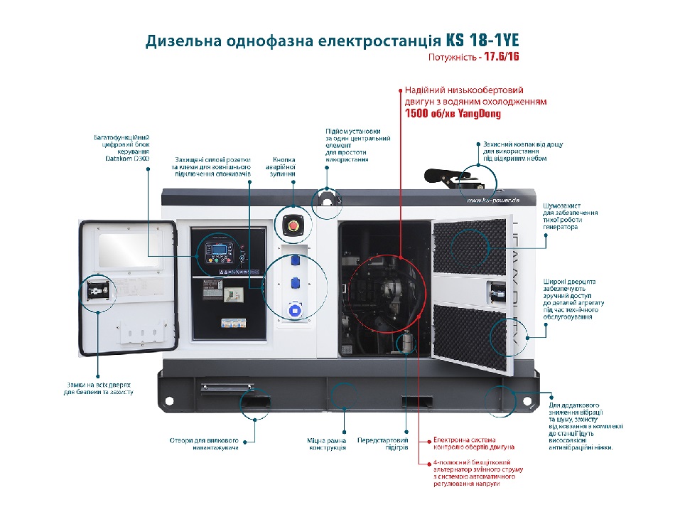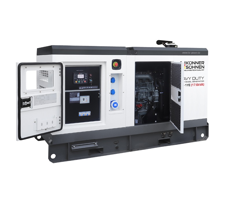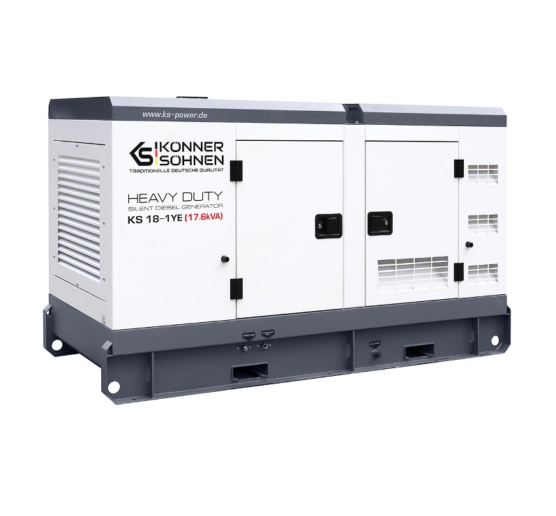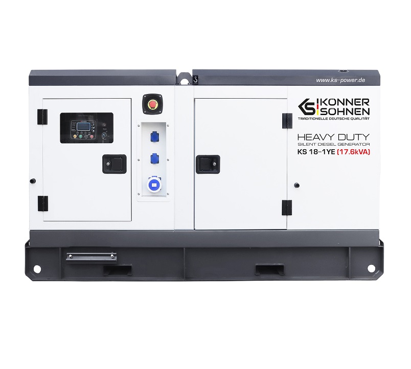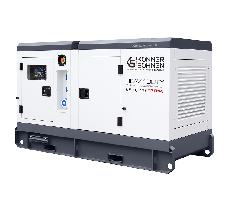 Дизельна однофазна електростанція KS 18-1YE серії HEAVY DUTY німецької торгової марки Könner & Söhnen – це надійна генераторна установка максимальною потужністю 17.6 кВА, що повністю відповідає високим європейським стандартам якості. Станція оснащена 4-циліндровим двигуном з рідинним охолодженням від виробника світового рівня YangDong. Компанія YangDong Co., Ltd – найбільший виробник багатоциліндрових дизельних двигунів та поставляє сучасну високотехнологічну продукцію більш ніж у 100 країн світу, поєднуючи бездоганну надійність і довговічність навіть у найекстремальніших умовах експлуатації. Компанія YangDong Co., Ltd активно виробляє двигуни на ринки Європи та США, де необхідна безумовна відповідність діючим нормам у галузі надійності, економічності, екологічності, технічної та експлуатаційної безпеки силових установок, що є найкращим підтвердженням високої якості продукції. Модель дизельного генератора KS 18-1YE оснащена 4-полюсним безщітковим альтернатором змінного струму з системою автоматичного регулювання напруги, підігрівом для зимового використання, з паливним баком на 76 літрів, розрахованому на 21 годину автономної роботи без дозаправки (при середньому навантаженні 50% витрата палива складає 3.7 літри/год), можливістю підключення системи автоматичного запуску/зупинки, всепогодним захисним антивандальним корпусом із звукоізоляцією та антикорозійним покриттям. Завдяки впровадженню власних розробок компанії та адаптації під вимоги Könner & Söhnen всі електростанції мають запас потужності по відношенню до заявлених характеристик.