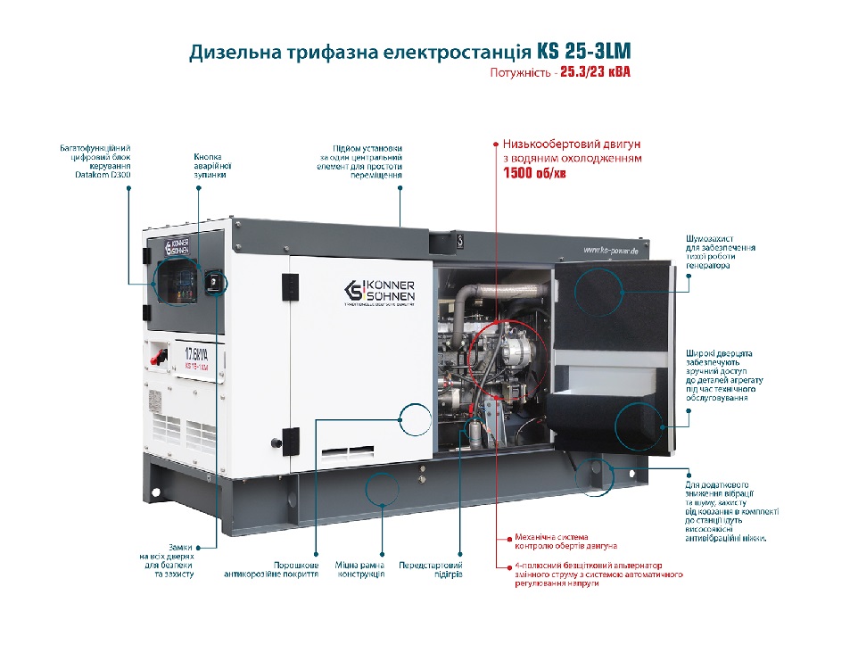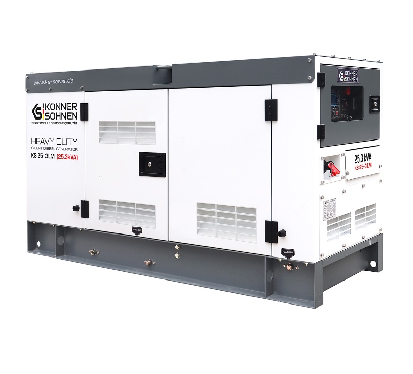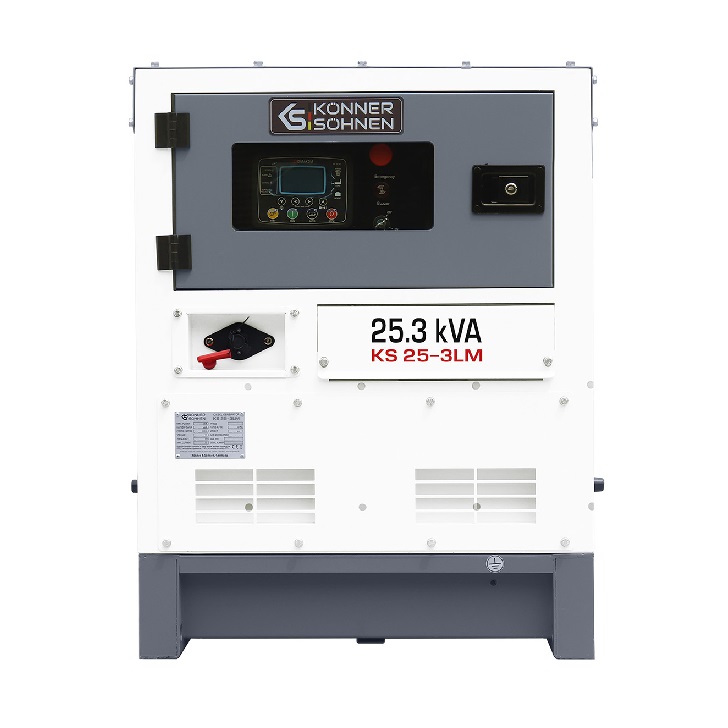 Дизельний генератор KS 25-3LM на базі низько обертового 4-циліндрового двигуна Laidong з рідинним охолодженням – це економічно вигідна пропозиція від ТМ Könner & Söhnen. Відповідає усім європейським стандартам якості, відрізняється високим рівнем безпеки, що дозволяє експлуатувати цей агрегат не тільки в побуті, а також у промисловості. Крім того модель дизельного генератора KS 25-3LM оснащена 4-полюсним безщітковим альтернатором змінного струму з системою автоматичного регулювання напруги, підігрівом для зимового використання, з паливним баком на 57 літрів, розрахованому на 14 годину автономної роботи без дозаправки (при середньому навантаженні 50% витрата палива складає 4,1 літри/год), можливістю підключення системи автоматичного запуску/зупинки, всепогодним захисним антивандальним корпусом із звукоізоляцією. KS 25-3LM – це потужний агрегат, забезпечений контролем всіх ключових параметрів робочого стану, може забезпечувати живлення як трифазних, так і однофазних споживачів. Завдяки впровадженню власних розробок компанії та адаптації під вимоги Könner & Söhnen всі електростанції мають запас потужності по відношенню до заявлених характеристик. В дизельних генераторах Könner & Söhnen враховані всі Ваші потреби в організації як аварійного, так і резервного живлення - для більш тривалого електропостачання житлових споруд та легких комерційних об’єктів.